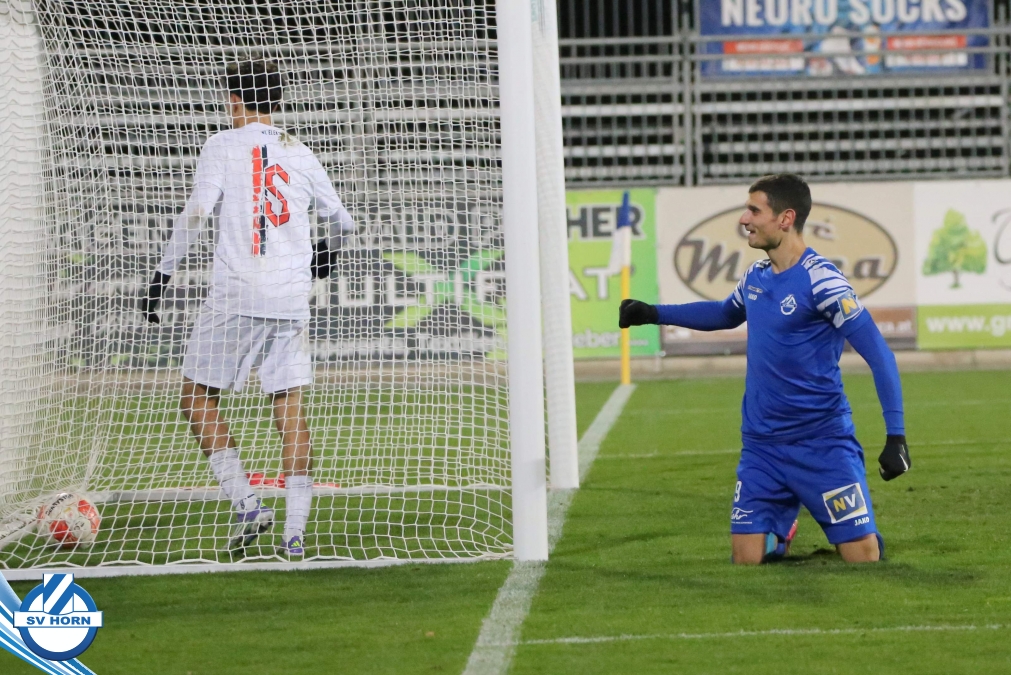 Lange Zeit tut man sich schwer gegen die tief stehenden Wiener, aber schließlich in der 26. Minute ist es dann Isa Drammeh nach einem Freistoß, der mit einem Fallrückzieher den von der Mauer geblockten Ball, den der Gästegoalie nicht mehr festhalten kann, der Horn in Führung bringt. Nur 4 Minuten später ist es dann Torjäger Zocki Mihailovic, der einen Ball über die Verteidigung im Lauf annimmt und zum 2:0 abschließt.