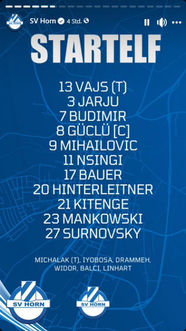 Der SV Horn spielte mit: Vajs; Hinterleitner (68. Iyobosa), Kitenge, Mankowski, Surnovsky, Güclü, Mihailovic, Nsingi (72. Drammeh), Bauer, Jarju, Budimir (90+7. Widor).
